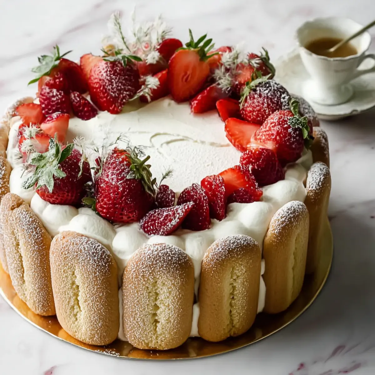 6. Kühlen und dekorieren: Die Charlotte darf jetzt über Nacht im Kühlschrank durchziehen. Kurz vorm Servieren mit Sahne-Tuffs, frischen Erdbeeren und – für einen Hauch Luxus – vielleicht etwas Goldfolie oder einem Hauch Puderzucker krönen.